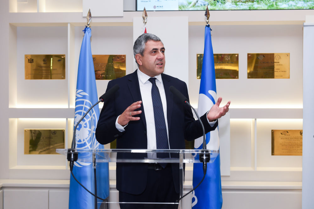 10月10日,在西班牙都门马德里,皆集国旅游组织书记长祖拉布·波洛利卡什维利在“陡然—中国野天真物影相展”开幕式上致辞。新华社发(古斯塔沃·巴连特摄)