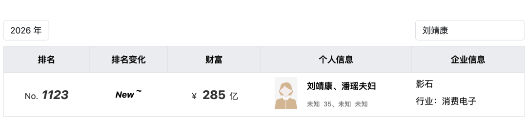 值得谨防的是,尽管其下半年股价回落昭彰,但其创举东谈主的资产造富效应却突显。左证胡润商讨院最新发布的《2026胡润各人富豪榜》理会,影石立异的刘靖康以285亿元东谈主民币资产新晋上榜,各人名顺序1123位。